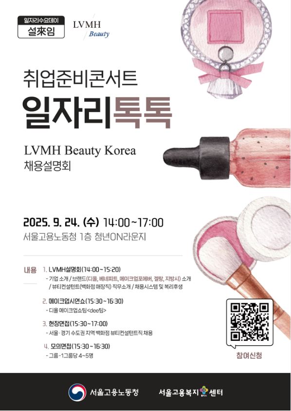 102 | 취업지원 | 서울고용노동청과 함께하는 취업준비콘서트_일자리톡톡(LVMH Beauty Korea) | 2025-09-18 | 63 | ||