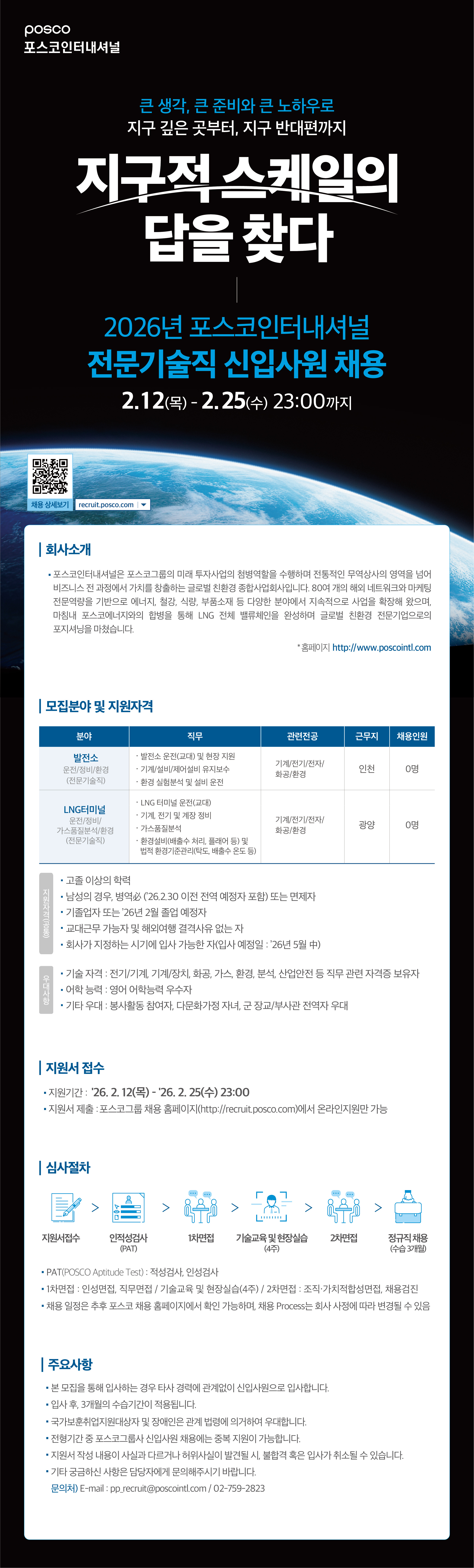 | 145 | 취업지원 | [우수채용정보] 포스코인터내셔널 (발전소,LNG터미널)부문 채용 | 2026-02-23 | 14 | ||
