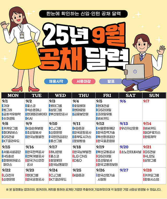 104 | 취업지원 | 2025년 9월 공채달력 (신입,인턴 공채달력) | 2025-09-18 | 66 | ||