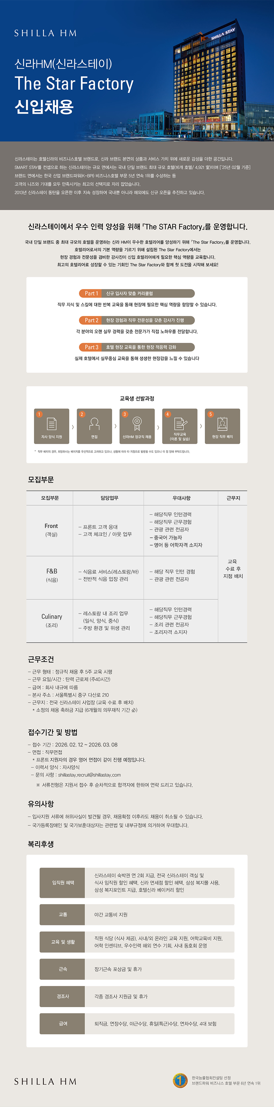 | 144 | 취업지원 | [신라스테이(신라HM)] 신입 채용 (THE STAR FACTORY) 7기 | 2026-02-23 | 49 | ||